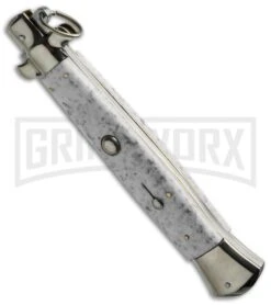 This beautiful Italian Stiletto features a stag handle with a polished cross bolster and lock back mechanism. Polished stainless steel dagger style blade. Blade stamped “A.G.A. CAMPOLIN Maniago-Italy 2012”