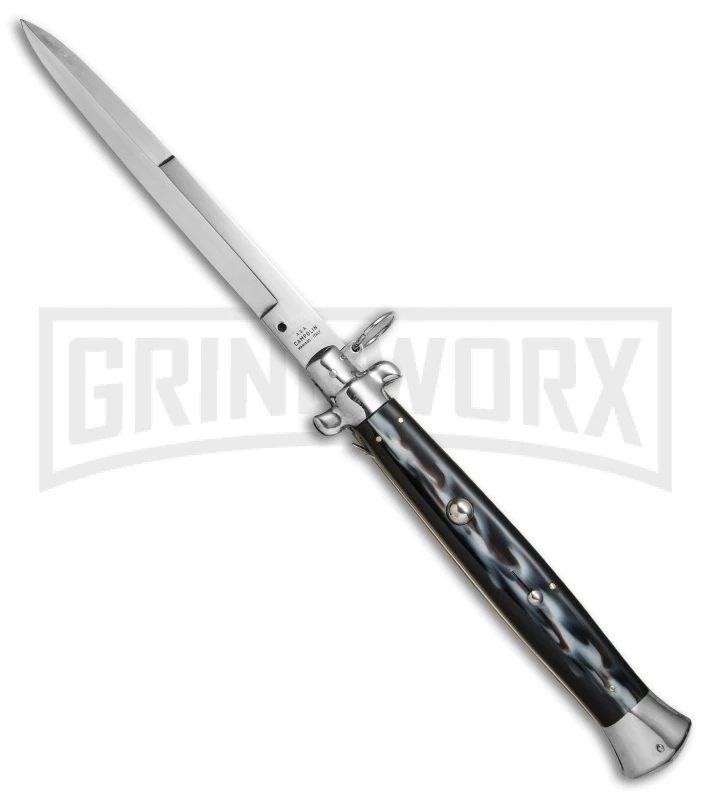 A.G.A. Campolin 18″ Italian Stiletto Sim Dark Horn Ring Pull Auto Knife – Bayo