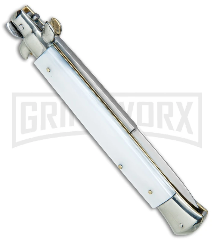 This 2017 edition stiletto from AGA Campolin is certain to become one of your favorites. The bayonet blade has a high polish finish and is stamped with “AGA Campolin Italy 2017” on the blade tang. The bolsters and buttons are polished nickel silver, while the liners and pins are polished brass, lending a rich tone to this elegant knife. The white pearlex handle scales give this knife a sleek appearance. To close the blade, pry back the pick-lock at the base of the blade spine. This is a gorgeous piece to include in any knife collection. Comes in a collectible tube with certificate of authenticity.