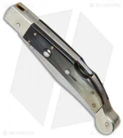 AGA Campolin’s Frosolone picklock stiletto is a stunning classic you’ll want in your collection. The traditional bayonet blade is made of polished stainless steel with an “AGA Campolin” and “Made in Italy” tang stamp on the front. This beautiful design has authentic abalone handle scales, with polished brass used on the bolsters, push button release, and sliding safety. Brass liners and pins add a final touch of elegance to this gorgeous piece. The action is swift and the lock up is secure. This knife clearly shows the old-world style craftsmanship that AGA Campolin is known for.