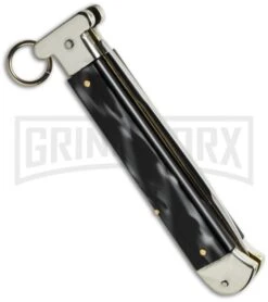 This Zero+ Italian automatic sports a black G-10 handle and a black finished dagger blade. The AGA Campolin Zero+ features a fully automatic leverlock design. It has a stainless steel bolstered handle with grippy textured G-10 handle scales.