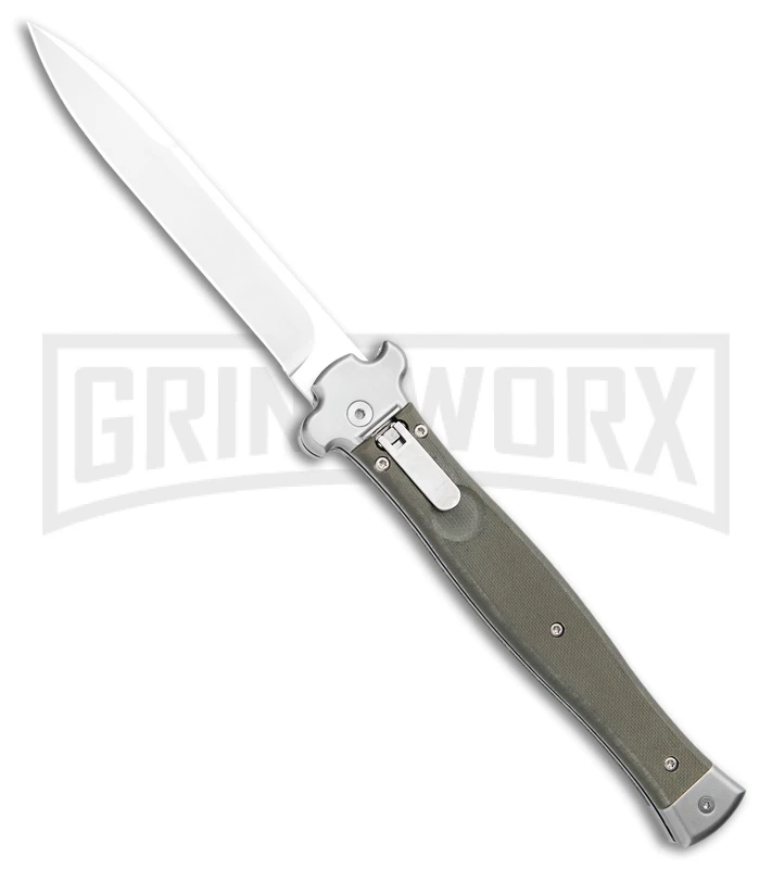 This Zero+ Italian automatic sports an OD green G-10 handle and a satin finished bayonet blade. The AGA Campolin Zero+ features a fully automatic leverlock design. It has a stainless steel bolstered handle with grippy textured G-10 handle scales.